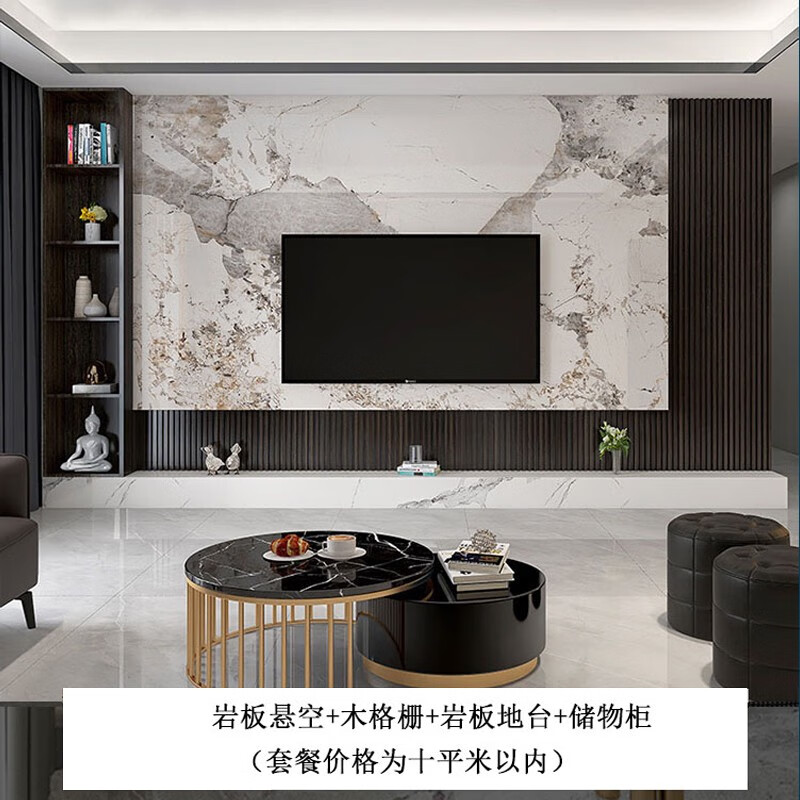 溥畔悬空岩板电视背景墙瓷砖大理石轻奢新中式客厅电视